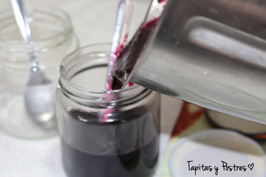 Vertemos en frascos esterilizados. Acordaros de poner una cucharilla dentro para que no estalle el cristal. Damos la vuelta y dejamos enfriar boca abajo.