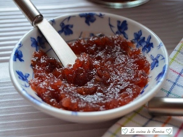Cocer todos los ingredientes en la cazuela a fuego flojo , removiendo y vigilando constantemente para que no se pegue , con una cuchara o paleta de madera. Cuando tome temperatura añadimos el agar agar. Según se quiera el espesor, la dejaremos cocer unos 35 minutos aproximadamente y el resto del proceso igual. Trituraremos o dejaremos tal cual , según la textura que mas nos agrade.