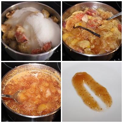 Trituramos y comprobamos que tiene la textura perfecta de la mermelada. Para ello ponemos en un plato una cucharadita y con el dedo hacemos una marca en el centro , si no se junta, es que la mermelada está en su punto, si se junta, la dejamos cocer un poco mas.