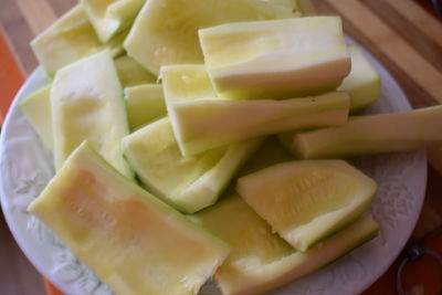 Para la elaboración de la primera mermelada de calabacines, tomé como referencia haciendo algunos cambios, la que nuestra amiga Marisa G. publicó en Thermofán ( mermelada ácida de calabacines,) y donde nos sugería la utilización del calabacín negro. La curiosidad pudo conmigo, me preguntaba cómo quedaría utilizando calabacín negro en vez de blanco. No lo dudé, eliminé el agar-agar pues poniendo berenjena no hace falta. Además, quité toda la piel pues es dura, a diferencia del blanco.