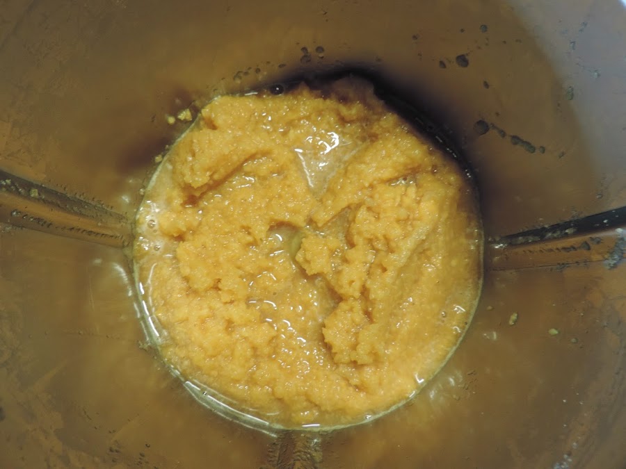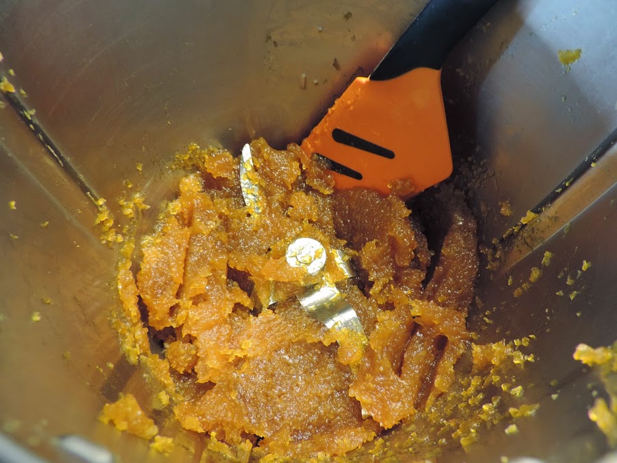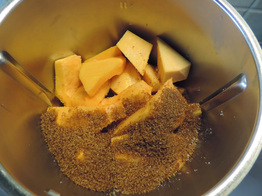 Poner la calabaza en trozos, el azúcar y el zumos de limón en el vaso del thermomix.