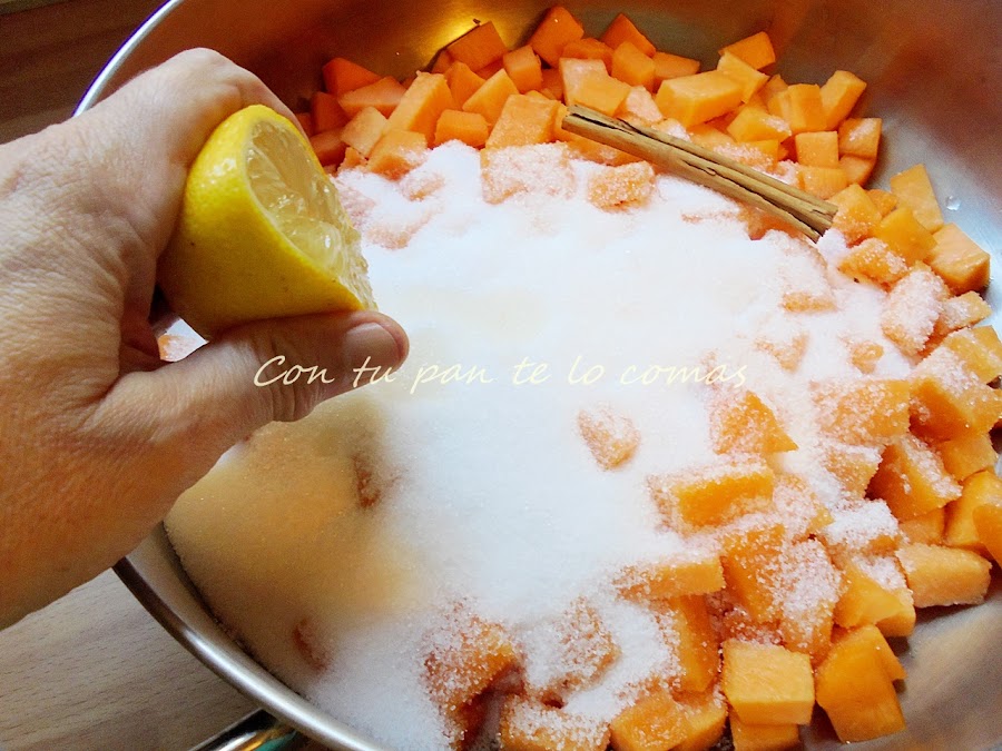 1. Trocear la calabaza en trocitos pequeños. Poner en una olla junto con el azúcar y la ramita de canela. Exprimir el zumo de un limón y poner a fuego fuerte para que rompa a hervir.