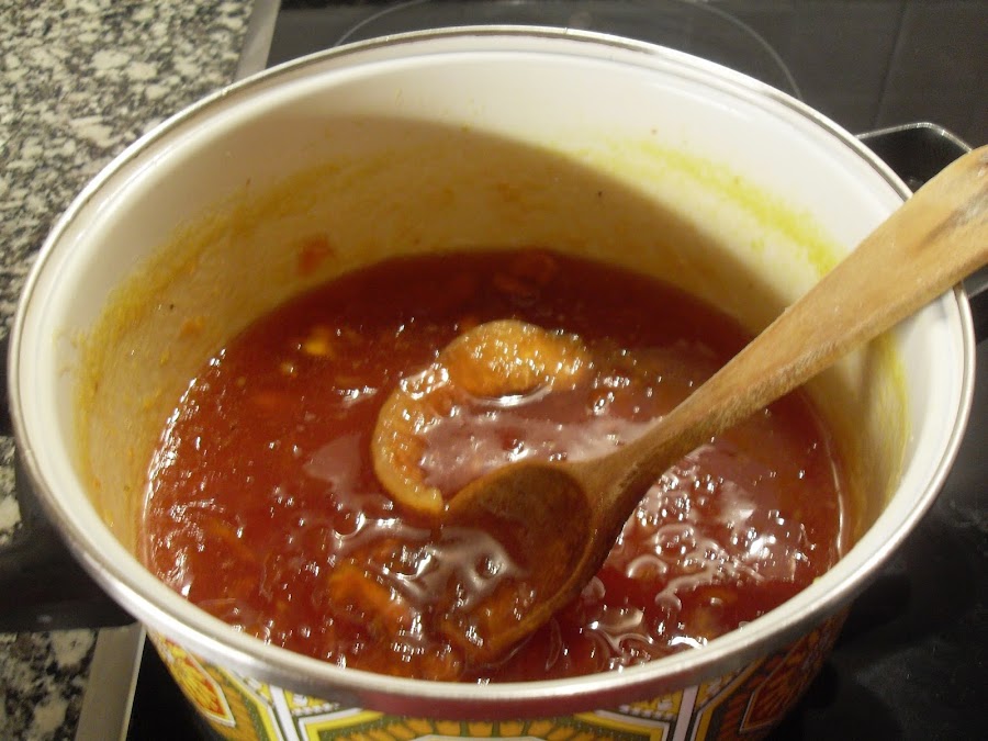 A los 15 minutos, añadir la raíz de jengibre pellada y rallada y la copita de licor, dejar que se espese poco a poco y removiendo para que no se pegue.