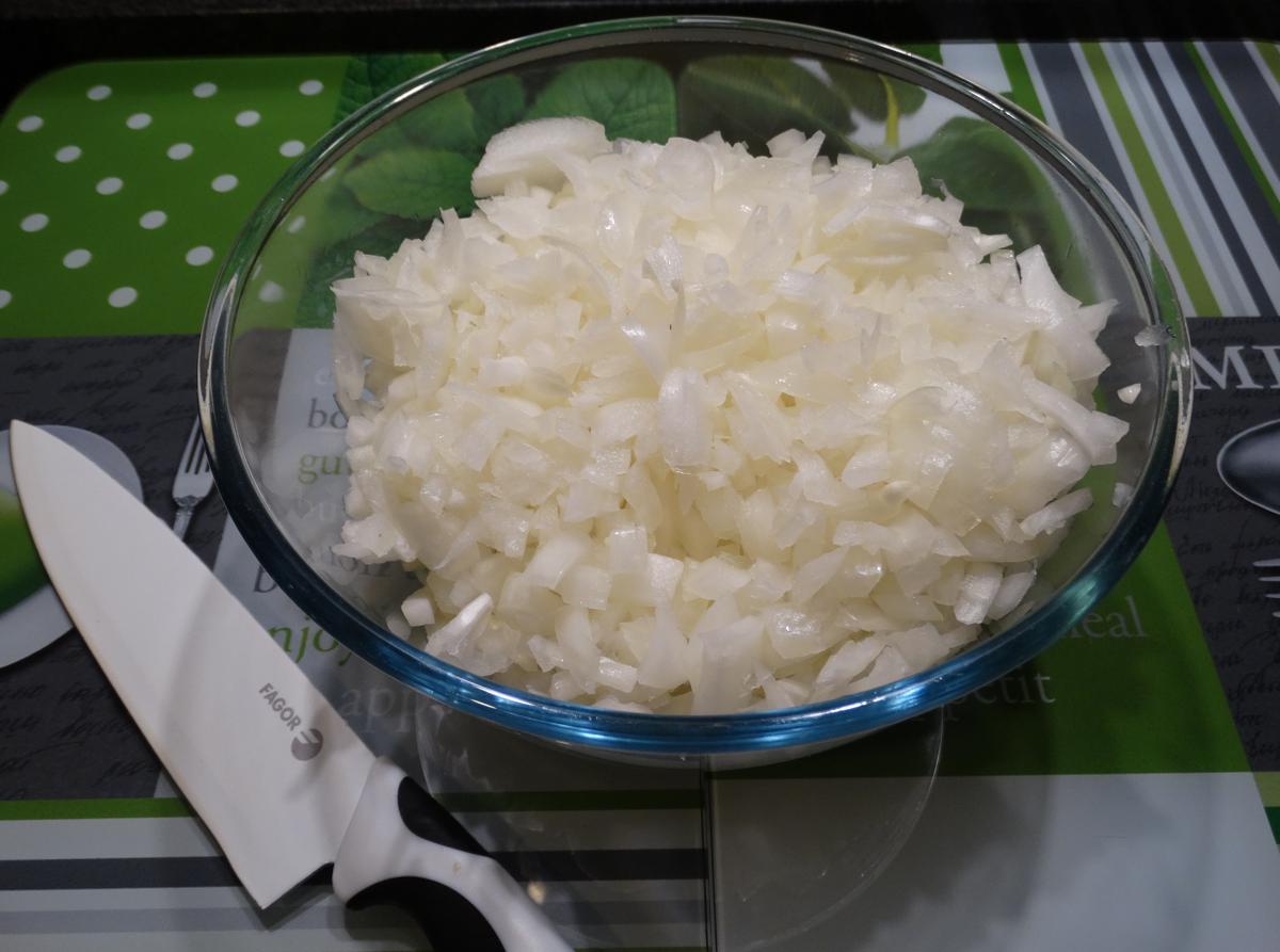 Picamos las cebollas y las rehogamos en una sartén con el aceite de oliva.
