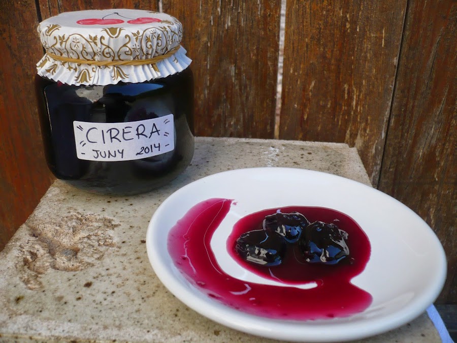 En una olla ponemos la fruta, el azúcar y el corrito de limón. Cuando hierva lo bajamos a fuego medio y, siempre destapado para que evapore líquido, dejamos cocer teniendo en cuenta que a medida que vaya pasando el tiempo lo tendremos que ir removiendo más a menudo. Aproximadamente una hora más tarde (cuando veamos que esté hecha) sacamos un poquito en un plato y comprobamos la textura de las cerezas y del líquido. Si está demasiado líquido, sacamos un vasito de líquido y lo dejamos templar un poco, añadimos la gelatina y cuando esté diluida la añadimos a la mermelada, removemos bien para integrarla y envasamos.