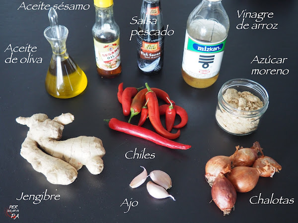 Pelar los ajos, el jengibre y las chalotas y cortar en trozos. Colocar en un procesador de alimentos, añadir los chiles cortados a rodajas y triturar hasta obtener una pasta.