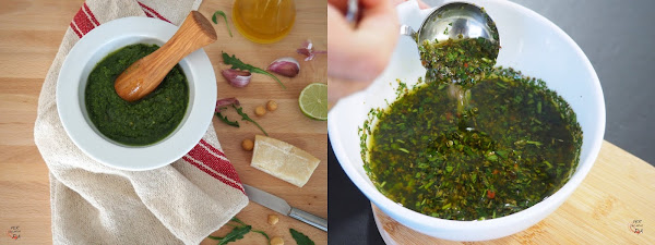 Y para contrastar el intenso color y sabor de la mermelada de chiles, os dejamos un par de salsas en tonos verdes, un Pesto de rúcula y avellanas ideal para pastas y un Chimichurri todoterreno (para ver las recetas hacer clic en los nombres)