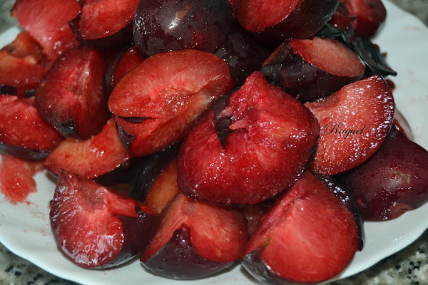 Lavamos las ciruelas, partimos a trozos y quitamos el hueso.
