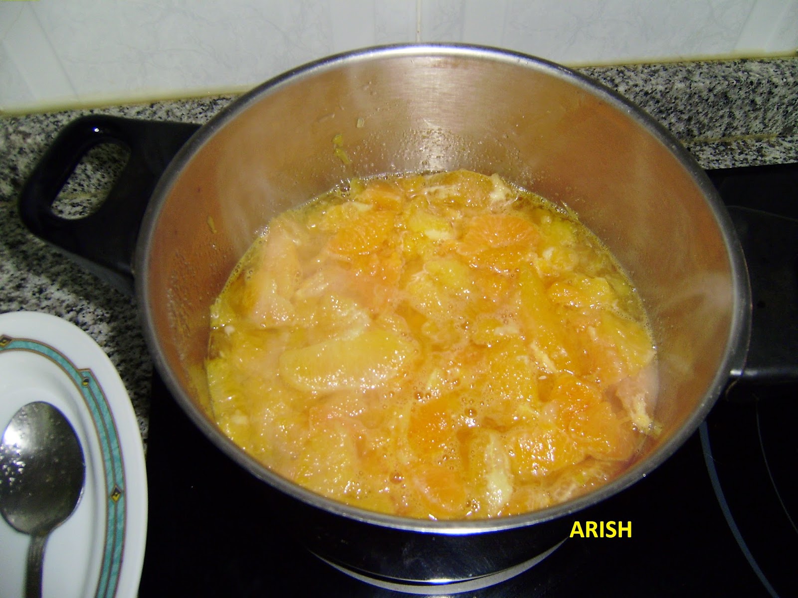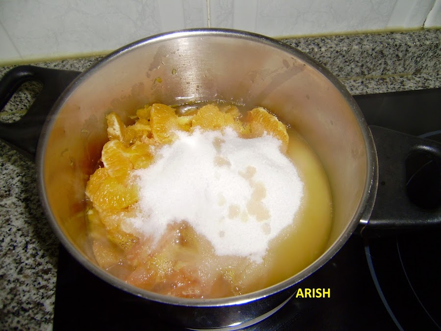 pelamos las naranjas, las mandarinas y los limones cuidando de que no queden pieles gruesas, semillas ó los hilillos de las mandarinas troceamos toda la fruta y la ponemos en una cazuela junto al azúcar y la ponemos al fuego