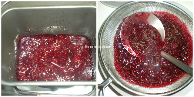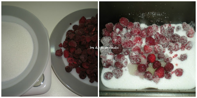 Poner las frambuesas y el azúcar en un robot de cocina (yo LA COCINERA) con pala de amasar,programa 18 por una hora y 10 minutos