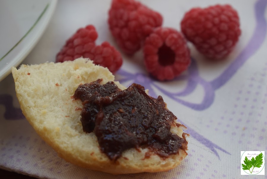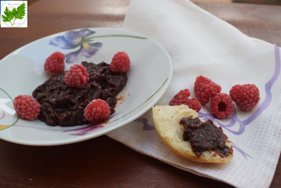 He hecho algunos cambios pues yo he utilizado azúcar y he puesto chocolate negro para postres, aprovechando un resto que tenía en casa. Ella puso chocolate negro con flor de sal, en cambio, he probado a añadir unas escamas de flor de sal una vez untada en el pan, de esta forma se potencia el sabor y es realmente deliciosa. En cuento a la preparación no he puesto a macerar la fruta, pero me dio buen resultado.
