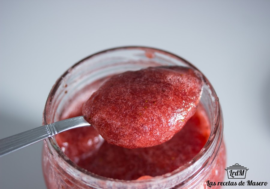 Una vez que ha terminado el programa, la pasamos a un bol y trituramos con la batidora. Yo la doy unos golpes cortos de batidora porque a nosotros nos gusta encontrarnos trocitos de fresa.