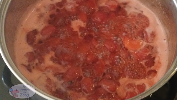 - Ponemos las fresas con su caldito en una cazuela y cocinamos con fuego medio-fuerte (posición 7 de la vitro) unos 15-20 minutos (estará lista cuándo las fresas estén blanditas y casi desechas, presentando ya la textura de mermelada).