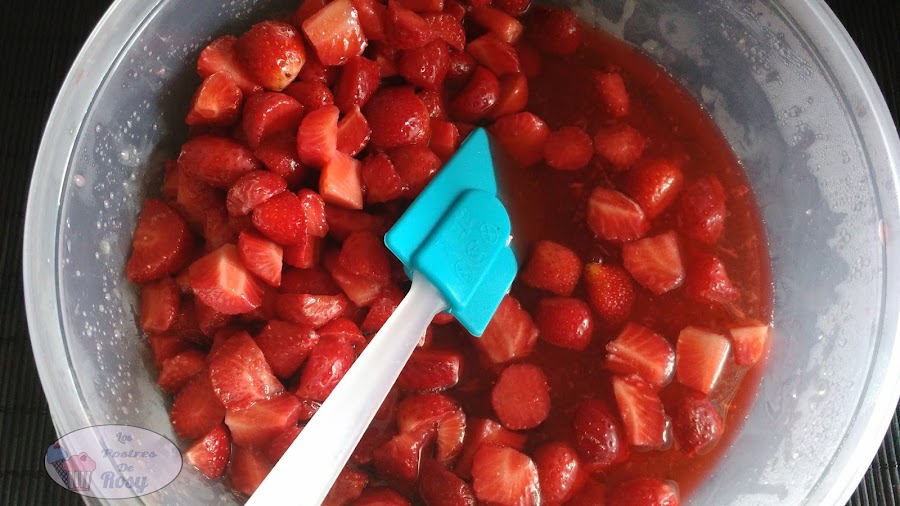 - Las ponemos en un recipiente, las cubrimos con el azúcar + el zumo de limón y mezclamos bien.