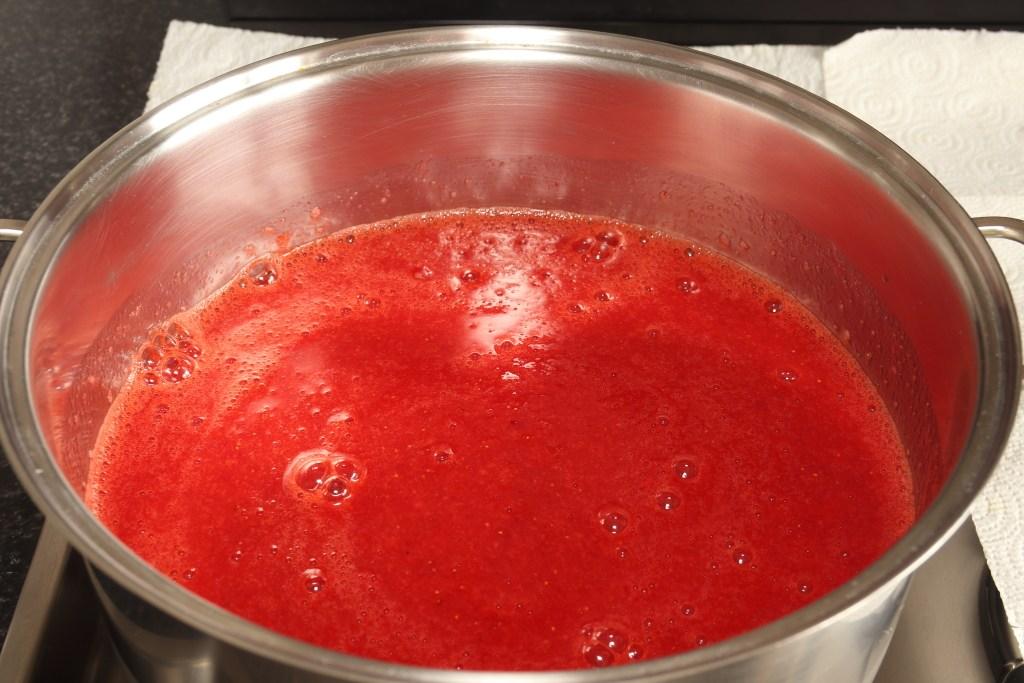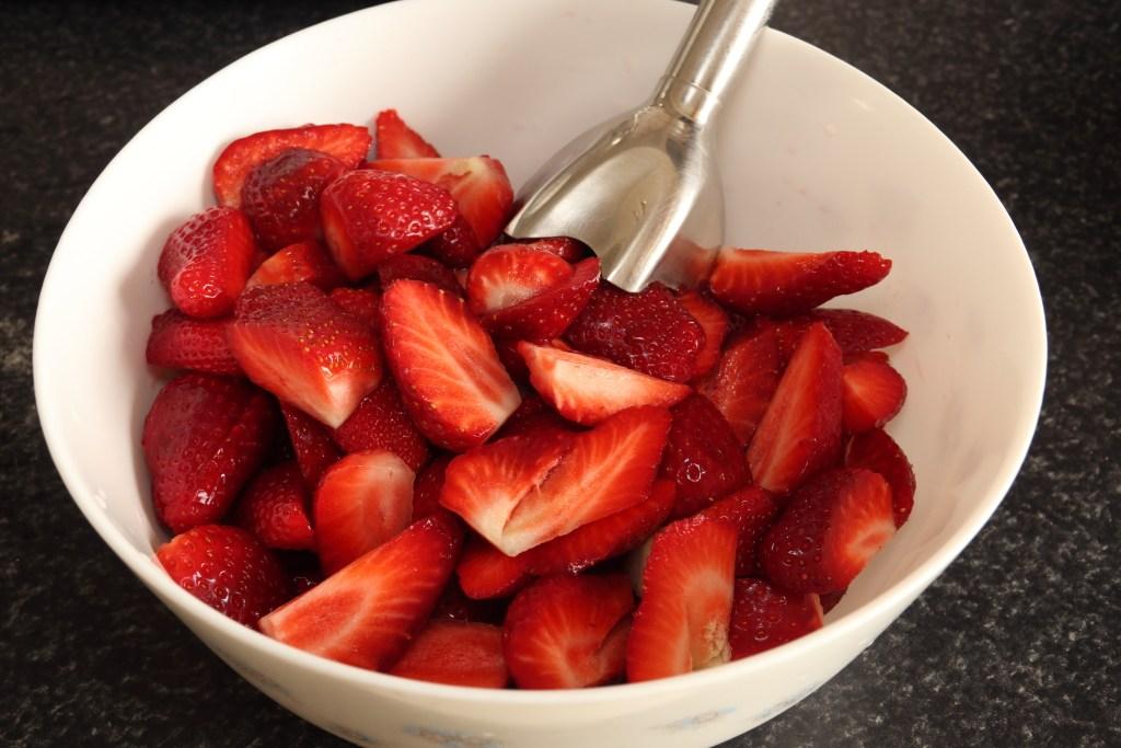 Pasamos por el grifo las fresas, retiramos el pedúnculo y las hojas, troceamos y trituramos con la batidora, no es necesario que queden totalmente trituradas, al cocer desaparecen los trozos.