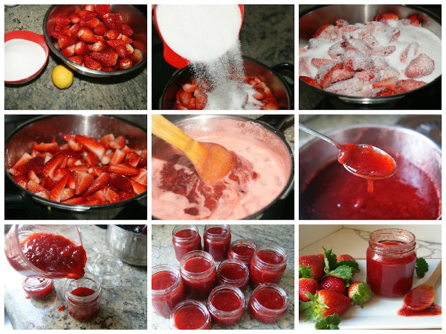 En una olla o cazuela grande colocamos las fresas cortadas por la mitad o en cuartos y le añadimos el azúcar y el zumo de limón colado para que no haya ninguna semilla. Se lleva a ebullición y se baja el fuego. Cocer a fuego lento y remover de vez en cuando. Pasada una hora aproximadamente, verás que ha reducido gran parte de agua. Quita la espuma con una cuchara.