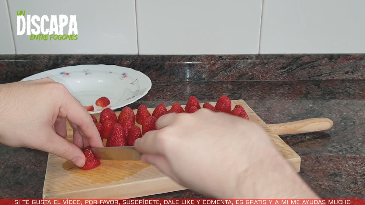 2Después partimos las fresas por la mitad, si véis que las fresas son muy grandes las partís en 4 trozos.