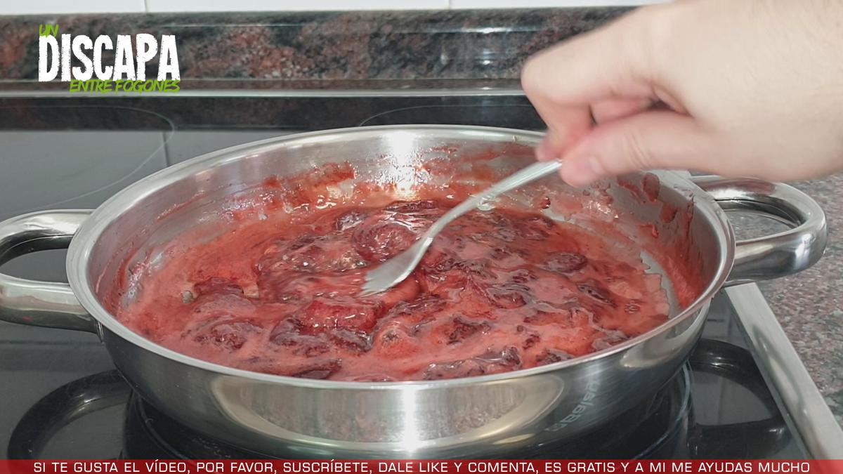 4Pasados unos 30 minutos con la ayuda de un tenedor vamos a aplastar los posibles trozos de fresa que han podido quedar, así conseguiremos una mermelada más fina.