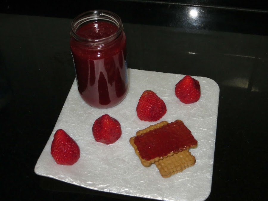 Ponemos las fresas con su jugo en una cacerola le añadimos el medio limón y las tenemos a fuego medio bajo durante 45 minutos. Pasamos la mezcla por la batidora y lo ponemos cinco minutos más. Lo metemos en nuestros tarros y ya tenemos lista nuestra mermelada. No os olvidéis de esterilizar bien los tarros para que os aguante bien la mermelada.