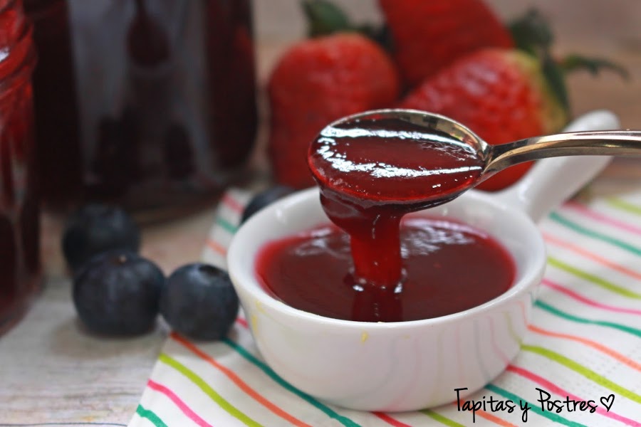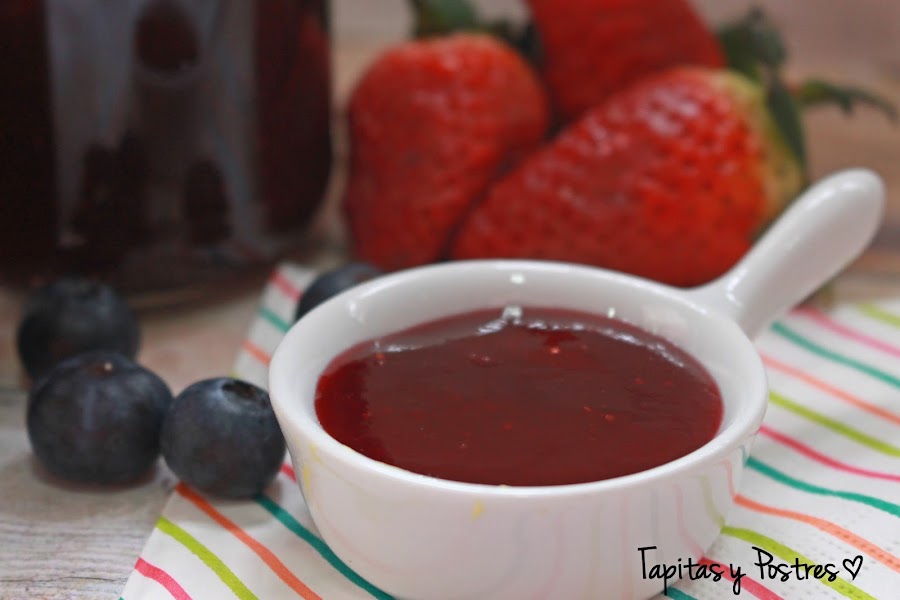 Hoy he hecho esta mermelada de fresas añadiendo arándanos, y ha quedado de lujo. Me han salido dos tarritos, uno lo voy a regalar y el otro ya estoy pensando en que gastarlo.