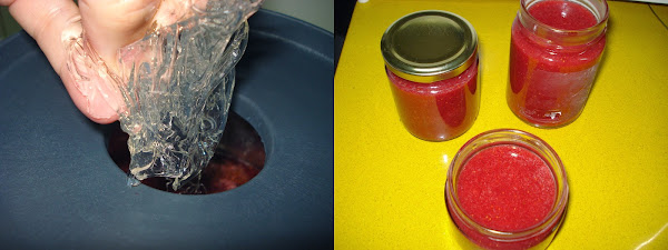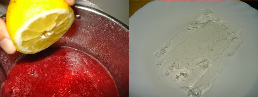 Dejaremos cocer hasta que tome el espesor necesario, aproximadamente 45 minutos. Si optamos por usar láminas de gelatina natural, primero hay que ponerlas a hidratar y las agregamos a la mermelada casi al final de la cocción ( en nuestro caso como no teníamos este día manzana usamos 3 hojas de gelatina, pero nos gusta más la manzana natural)