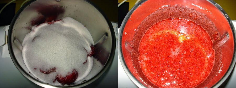 Ponemos la báscula en marcha, echamos en el vaso las fresas lavadas y sin las hojas verdes y tomamos referencia del peso (en nuestro caso 800 g). Agregamos el zumo de limón, colocamos a báscula a cero y añadimos la cantidad de azúcar equivalente a la mitad del peso de las fresas (en nuestro caso 400 g). Batimos unos segundos a velocidad 5.