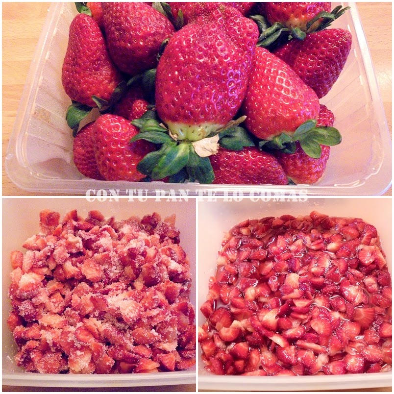 2. Una vez cortadas hay que pesarlas y añadir la mitad del peso en azúcar. Se remueve bien el azúcar con las fresas y se deja reposar a temperatura ambiente por lo menos una hora.
