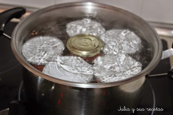 La retiramos del fuego y la metemos en tarros de cristal esterilizados. Yo los pongo dentro una cazuela con agua a hervir durante 5 minutos.