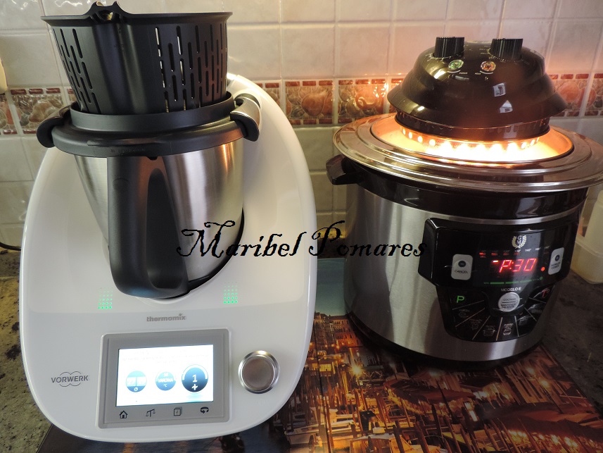 Programamos 30 minutos, varoma, velocidad 1, sin el cubilete y con el cestillo encima de la tapa para que no salpique.