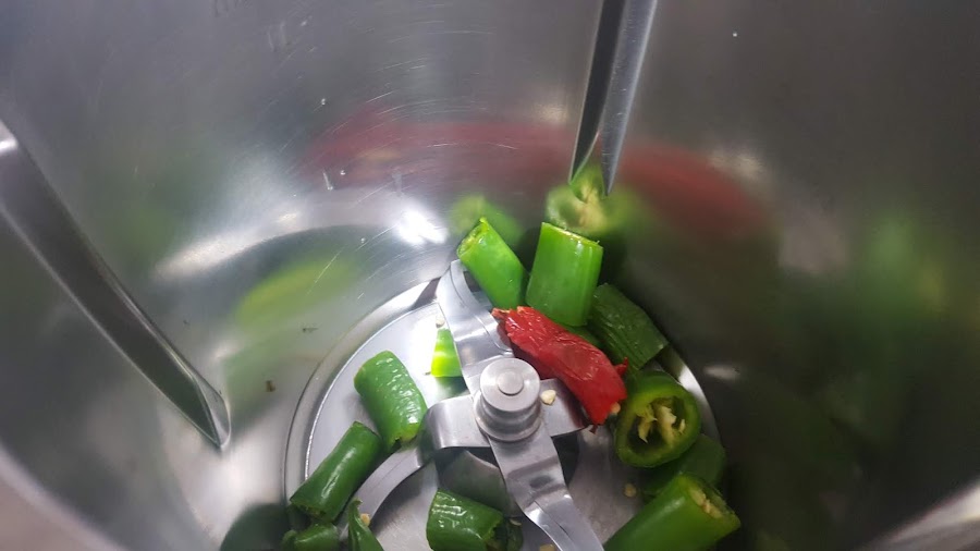 2.- En el vaso de la thermomix ponemos las guindillas y el pimiento a trozos y programamos 4 segundos, velocidad 6, para que queden bien picadas.