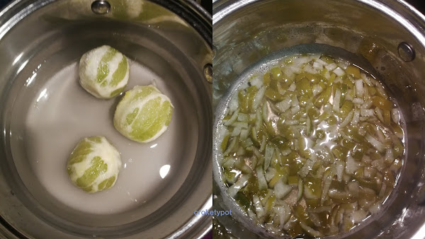 ELABORACIÓN: Lavamos la fruta y la ponemos en un bol con agua durante 24 horas. Al día siguiente pelamos las limas y las limas enteras las ponemos a cocer, no tiramos el agua.