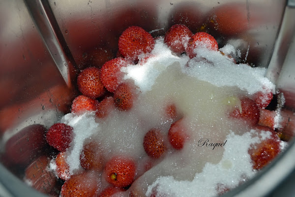 Metemos en el vaso los madroños, el azúcar y el zumo del limón, y trituramos 5 segundos velocidad 6.