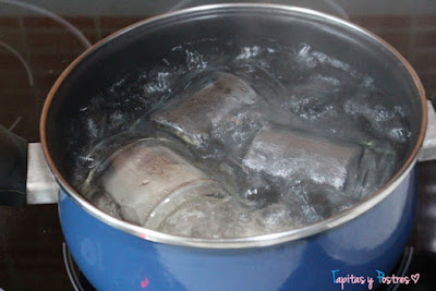 Mientras se prepara la mermelada, hervimos los botes y sus tapas 20 minutos en una olla con agua hirviendo. Luego los sacamos con cuidado (ayudándonos de una espumadera o algo similar) y los dejamos secar en el horno a 40º hasta que estén secos. Una vez embotada la mermelada seguid los pasos del enlace que os he puesto más arriba para conservarla correctamente.