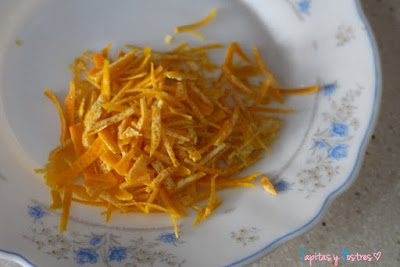 Lavamos muy bien las mandarinas y las pelamos lo mejor posible. La piel de una de ellas la cortamos a tiras. Evitaremos que tenga piel blanca, que amarga.