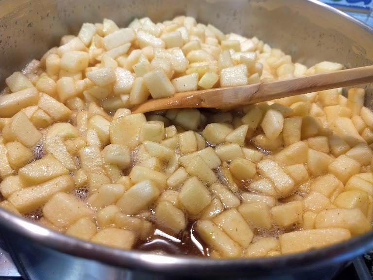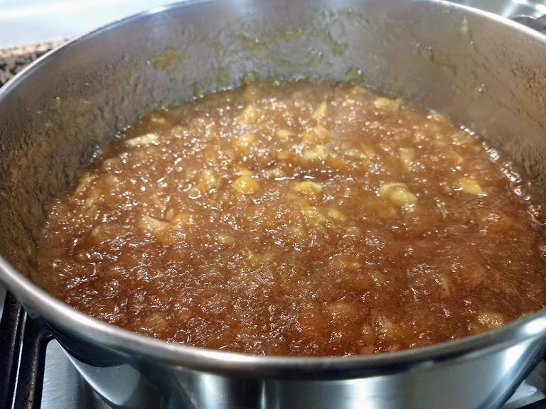Si os quedan trocitos de manzana podéis aplastarlos con la ayuda de un tenedor, o no, según os guste la textura más o menos fina. Poco a poco, veréis que la mezcla coge la textura de mermelada y un característico color marrón.