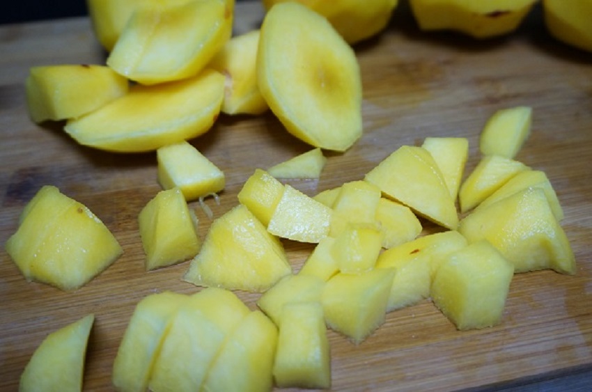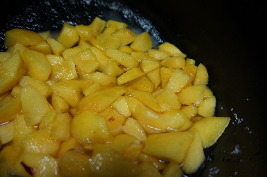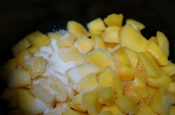 En la cazuela donde vayamos ha cocinar el melocotón pondremos los trozos de melocotón, el medio zumo de limón y el azúcar.