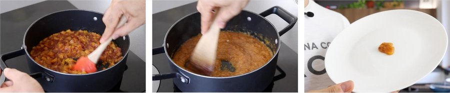 Cuando la cucharita de mermelada esté fría inclina el plato. Si está todavía liquida veras le mermelada moverse rapidamente. Si está lista verás que está firme.