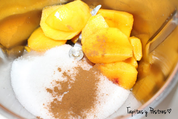 Pelamos los melocotones y los troceamos. Los ponemos en el vaso de la thermomix junto con el azucar, canela y zumo de limón. Trituramos 10 segundos a velocidad 7 y comprobamos que está a nuestro gusto. A mi no me gustan los "tropezones" y la trituro totalmente pero si os gusta encontrar trocitos, la trituración debe ser menor.