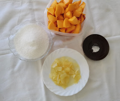 Ya tengo los ingredientes encima de la mesa y listos para preparar la mermelada, estos melocotones son hermosos y los cinco pesan algo mas de 1,500 kgr