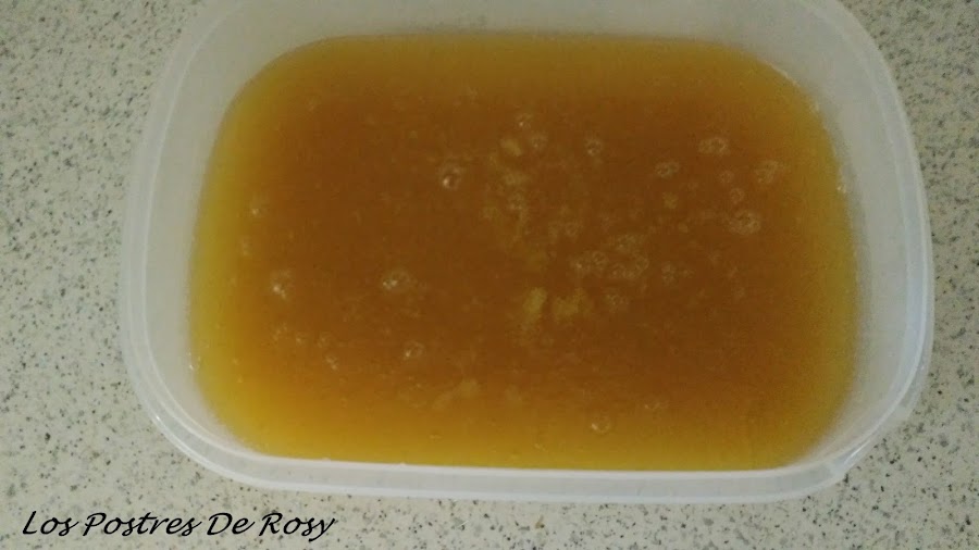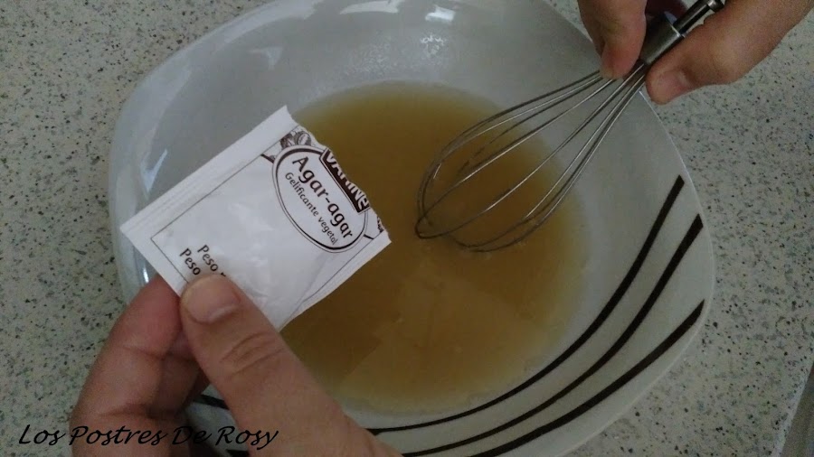 5º. Pasada la hora, retiramos la piel y la vaina, disolvemos el agar en el almíbar frío y se lo agregamos.