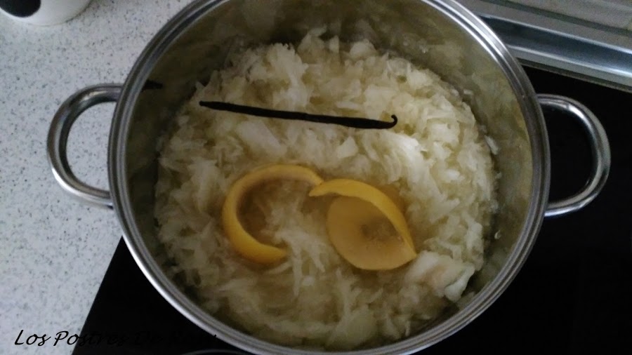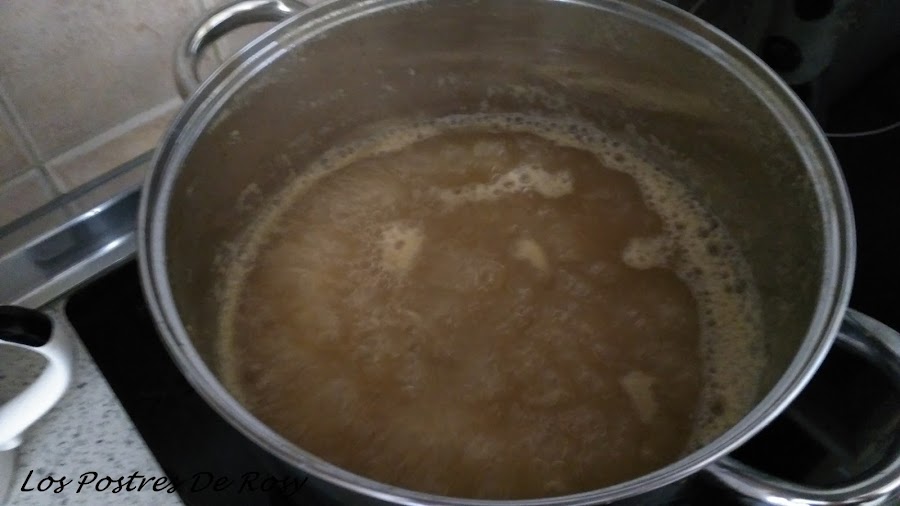 4º. Cuando hierva, retiramos un vaso de almíbar y bajamos el fuego a media potencia. Dejamos que reduzca 1 hora.