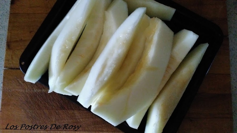 1º. Limpiamos bien el melón: le quitamos la cáscara, las pepitas y hacemos rodajas (para manejarlo mejor).