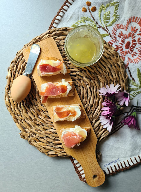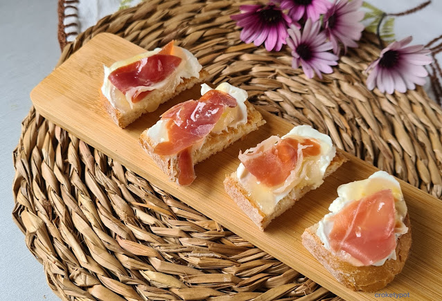 Para nuestra tapa de melón con jamón, tostaremos un poco de pan, le ponemos queso de cabra, luego nuestra mermelada de melón y una loncha de jamón serrano.