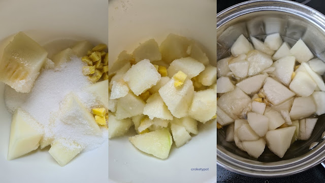 INGREDIENTES: 500 gr. de melón piel de sapo, 200 gr. de azúcar, 30 gr. de jengibre, 1 cucharada de zumo de limón.