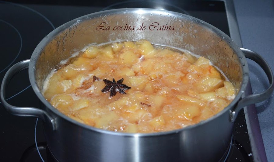 En una cazuela ponemos los membrillos limpios y troceados, con el resto de los ingredientes a cocer a fuego medio durante media hora removiendo de vez en cuando para que no se pegue.