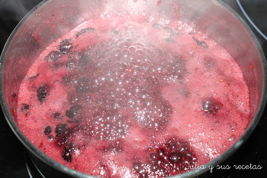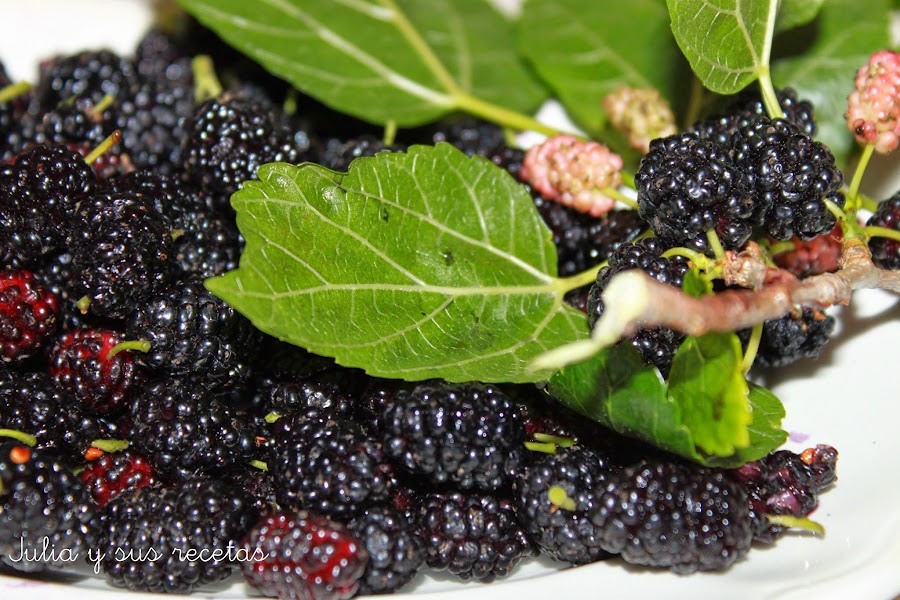La semana pasada fuí con mi marido a coger hojas de morera para alimentar a los gusanos de seda que tiene en el cole y estaban las moreras llenitas de moras!! así que ni corta ni perezosa me puse a coger unas pocas, bueno mas que unas pocas, salí con las manos tan moradas como ellas mismas pero me llevé a casa una buena bolsa...