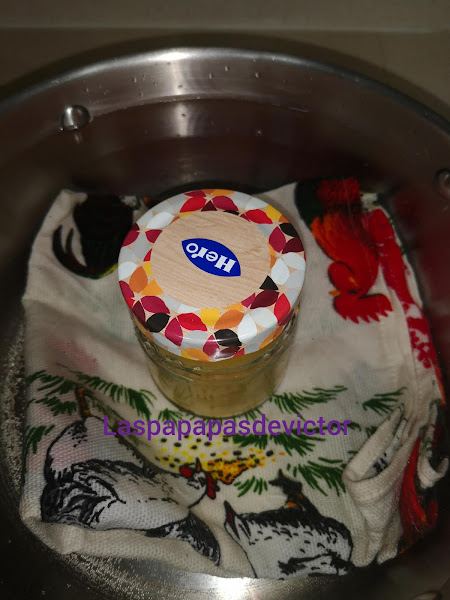 Poner en una olla alta un trapo y agua hasta casi cubrir los frascos tapados, hervir durante 20 min