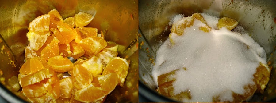 Pesamos las naranjas, las ponemos en una olla y les añadimos la misma cantidad de azúcar (normalmente, en casa, a las mermeladas les añadimos la mitad de azúcar de lo que pesa la pulpa, pero si la naranja es más ácida le añadimos la misma cantidad de azúcar que de pulpa), agregamos la ralladura.