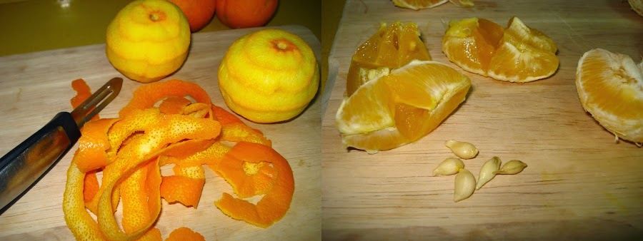 Pelamos las naranjas quitándoles todo lo blanco. Las partimos y les quitamos las pepitas.