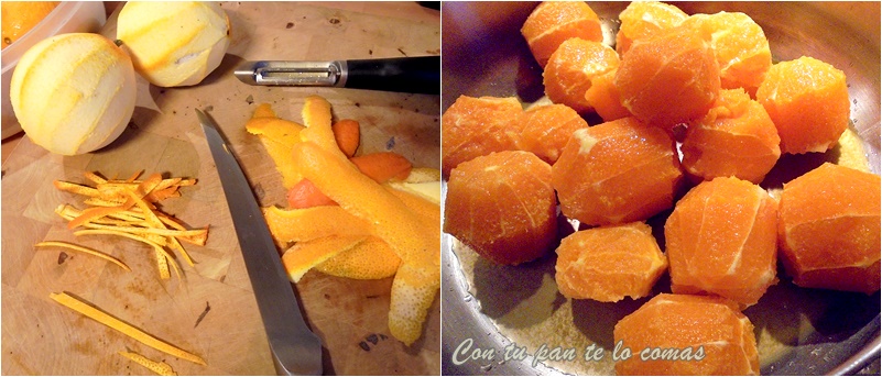 2. Pela el resto de las naranjas, todas sin la parte blanca que es la que amarga, y pésalas. Las mías pesaban más de dos kilos y se quedaron en 1.3 kg. Calcula ahora la mitad de ese peso en azúcar.
